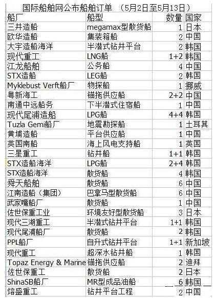 根據(jù)國(guó)際船舶網(wǎng)公布的5月2日至5月13日的船舶訂單來(lái)看,鉆井船和液化船高端領(lǐng)域的表現(xiàn)異常搶眼;中日韓仍然是世界上訂單最為活躍的三個(gè)國(guó)家。其中,韓國(guó)在高端造船上顯示出“誰(shuí)與爭(zhēng)鋒”的氣勢(shì),中國(guó)在高端領(lǐng)域亦有所收獲,但仍然以傳統(tǒng)造船為主,日本已經(jīng)走環(huán)保路線。