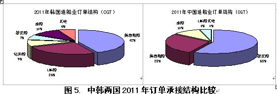 從造成2011年中國造船業(yè)在修正總噸計(jì)接單份額遠(yuǎn)低于韓國的原因來看,筆者認(rèn)為這與韓國在高技術(shù)高附加值船型市場的壟斷地位是分不開的。統(tǒng)計(jì)表明,在2011年韓國承接訂單船型構(gòu)成中,集裝箱船、LNG船、鉆井船訂單占其訂單總量42%、28%和9%,而散貨船占比僅為7%;相反,在2011年中國訂單構(gòu)成中,散貨船占比達(dá)到58%,而集裝箱船和LNG船占比僅為28%和4%。