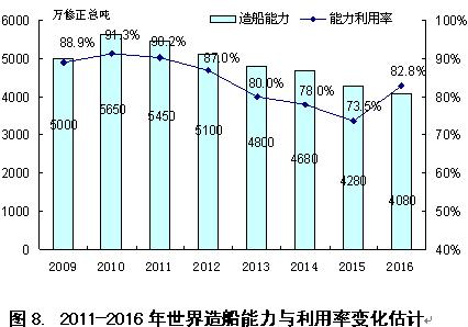 筆者認(rèn)為,這種矛盾最終會(huì)通過造船能力的逐漸萎縮和產(chǎn)能利用率下降的形式表現(xiàn)出來。據(jù)英國克拉克松公司估計(jì),2011-2016年期間全球造船能力將縮減28%,并且,在此基礎(chǔ)上全球造船能力利用率于2015年下滑至階段性低點(diǎn)73.5%,然后于2016年開始出現(xiàn)回升。為此,筆者認(rèn)為,同處于產(chǎn)能萎縮和能力利用率下降的階段,新船價(jià)格有效反彈或回升缺乏最基本的支撐,更何況,處于世界造船業(yè)去產(chǎn)能化初期階段的2012年,價(jià)格回升的可能性的概率極低。