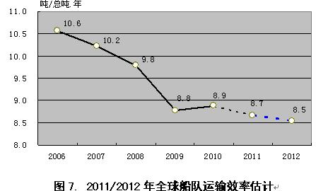 就2012年走勢看,衡量運(yùn)力供求關(guān)系變化的一個(gè)核心指標(biāo)――船隊(duì)運(yùn)輸效率,即每總噸運(yùn)力年運(yùn)輸貨物量(噸/總噸.年),仍在走低。筆者主要結(jié)合2012年運(yùn)力和海運(yùn)量預(yù)計(jì)的增長,大體估算如下:船隊(duì)增長方面,結(jié)合可能的訂單交付量和拆解量,估計(jì)到2012年底全球船隊(duì)保有量將達(dá)到11.046億總噸,較2011年增長6.6%;海運(yùn)量增長方面,取2011年的增速(IMF對2011年和2012年世界經(jīng)濟(jì)增速預(yù)測都為4.0%),估計(jì)2012年全球海運(yùn)總量將達(dá)94.3億噸;如此一來,即使不考慮船隊(duì)降速行駛的情況下,2012年全球船隊(duì)運(yùn)輸效率將由2011年的8.7(噸/總噸.年)下降至8.5(噸/總.年),某種程度上表明2012年全球航運(yùn)市場運(yùn)力供求關(guān)系仍朝惡化態(tài)勢方向發(fā)展。假設(shè)上述分析成立,2012年國際航運(yùn)費(fèi)率估計(jì)仍會(huì)處于低位水平,船東經(jīng)營狀況也不會(huì)有好的表現(xiàn),船東新造船投資信心和欲望估計(jì)也難被有效調(diào)動(dòng)。