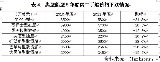 二手船市場對航運(yùn)市場的反應(yīng)較新造船市場更為直接,兩者存在相對同步性。國際航運(yùn)市場的低迷,加上船東看空后期市場情緒蔓延,2011年世界二手船市場成交水平不僅繼續(xù)延續(xù)2010年萎縮態(tài)勢,而且二手船價(jià)格再度出現(xiàn)深幅下挫,船東船隊(duì)資產(chǎn)價(jià)格再度大幅縮水。統(tǒng)計(jì)表明,2011年全年共成交二手船1064艘、5121萬載重噸,較上一年下滑了19%;典型船型5年船齡二手船價(jià)格平均跌幅在20%左右,其中,VLCC油船、好望角型散貨船和巴拿馬型散貨船跌幅高達(dá)31.8%、28.0%和26.4%,遠(yuǎn)遠(yuǎn)超過同期新船價(jià)格下行幅度。
