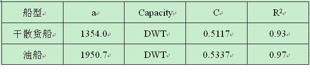 此基線公式由丹麥根據(jù)LR的Fairpiay中的數(shù)據(jù),結(jié)合當(dāng)時(shí)初步EEDI計(jì)算方式,通過一定假設(shè)以Capacity為自變量,采用指數(shù)函數(shù)的形式向IMO組織提出。通過對(duì)現(xiàn)有船型的回歸分析,得出其相應(yīng)的a和c的數(shù)值。