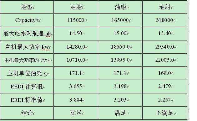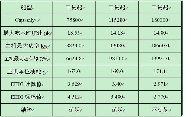 按EEDI的計(jì)算公式,對(duì)常規(guī)的三艘散貨船(75800t、115280t、180000t)進(jìn)行計(jì)算結(jié)果DWT75800t散貨船符合要求有余度;DWT115280t散貨船符合要求無余度;DWT180000t散貨船不滿足要求(詳見附表1)。