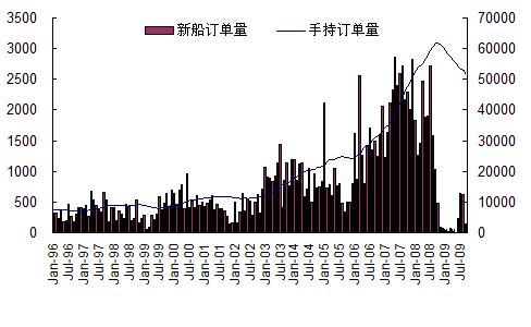 據(jù)英國克拉克松公司統(tǒng)計(jì),今年1-9月全球累計(jì)成交新船238艘、1896萬載重噸,同比下降88.3%;截止到2009年9月底,全球手持船舶訂單總量降至8671艘、5.17億載重噸,以載重噸計(jì),較去年10月歷史最高位下降了20%。