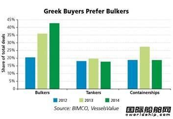 BIMCO的首席分析師Peter Sand表示:“過去兩年希臘船東的投資興趣集中于散貨船,并相對(duì)于油船和集裝箱船的均衡發(fā)展,這種趨勢(shì)越來越明顯地反映該領(lǐng)域的最大商機(jī)――宜早不宜遲?!?BR>    2014年希臘船東購買好望角型散貨船僅為4艘,投資興趣集中于小型散貨船,小靈便型及大靈便型/超靈便型散貨船占91艘的三分之二。