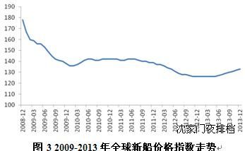 新船成交量的回落必然導(dǎo)致新船價格上升動力逐漸趨弱,但短期內(nèi)新船價格走低的可能性也不大。由于2013年成交量的大幅增長,大型船廠的接單壓力大幅緩解,部分船廠開始選擇性接單,提價逐漸成為共識。此外,新的經(jīng)濟(jì)增長周期正在逐步形成,原材料價格的小幅上漲和勞動力成本的剛性抬升均對船舶制造成本產(chǎn)生有力支撐。在這種情況下,預(yù)計2014年上半年,新船價格有望繼續(xù)緩慢上漲;2014年下半年開始,新船價格上升動力將逐漸減弱,保持平穩(wěn)的可能性較大。
