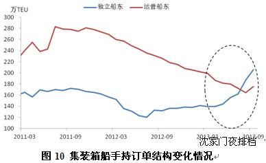 集裝箱船方面,班輪公司在上一輪大型船訂造熱潮中,主要通過自有資金進(jìn)行訂造。隨著班輪公司運(yùn)力升級的持續(xù)推進(jìn),新一輪訂造在2012年末再次啟動,推動集裝箱手持訂單量開始回升。但由于班輪公司運(yùn)營持續(xù)艱難,自有資金訂造能力受到大幅削弱,卻又不得不進(jìn)行運(yùn)力升級以保持市場份額,從而借助獨立船東的力量發(fā)展運(yùn)力,導(dǎo)致集裝箱船手持訂單的結(jié)構(gòu)發(fā)生很大變化,獨立船東手持訂單量逐步超過運(yùn)營船東,同時也推動融資租賃交易數(shù)量和融資額大幅增長。