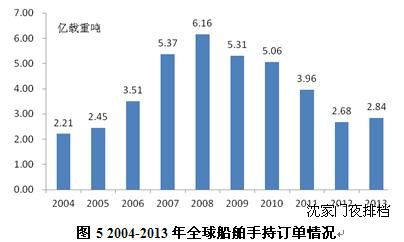 隨著全球造船完工量的回落和新船成交量的強(qiáng)勁反彈,全球船廠手持船舶訂單實現(xiàn)了危機(jī)以來年份的首次增長。截止2013年底,全球船廠手持訂單為4896艘、2.84億載重噸,載重噸位同比增長6.0%。具體到月份,2013年3月底,全球船舶手持訂單下降到2.52億載重噸的階段性低點,之后在新船成交量反彈的推動下持續(xù)回升。