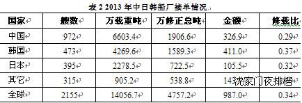 2013年,中國船廠接單總量依然保持全球第一,接單金額與韓國存在差距。以艘、載重噸和修正總噸計算,中國船廠的市場份額分別為45.1%、47.0%和40.1%,分別高于韓國船廠23.2、16.6和6.7個百分點;但按照接單金額計算,中國船廠的市場份額僅為33.1%,低于韓國船廠41.6%的市場份額,修載比也遠(yuǎn)低于韓國船廠。這反映了中國船廠在高價值船舶承接上仍處于相對弱勢。