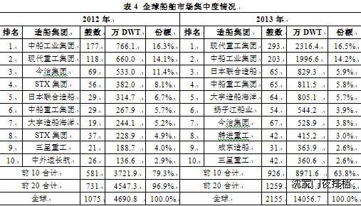 2013年,全球造船市場接單集中度保持高位,前10家造船集團(tuán)承接量占比為63.8%,前20家合計占比為78.6%,與2012年相比有所下滑,主要原因是成交量的大幅反彈為不少前期接單困難的大中型船廠帶來訂單。